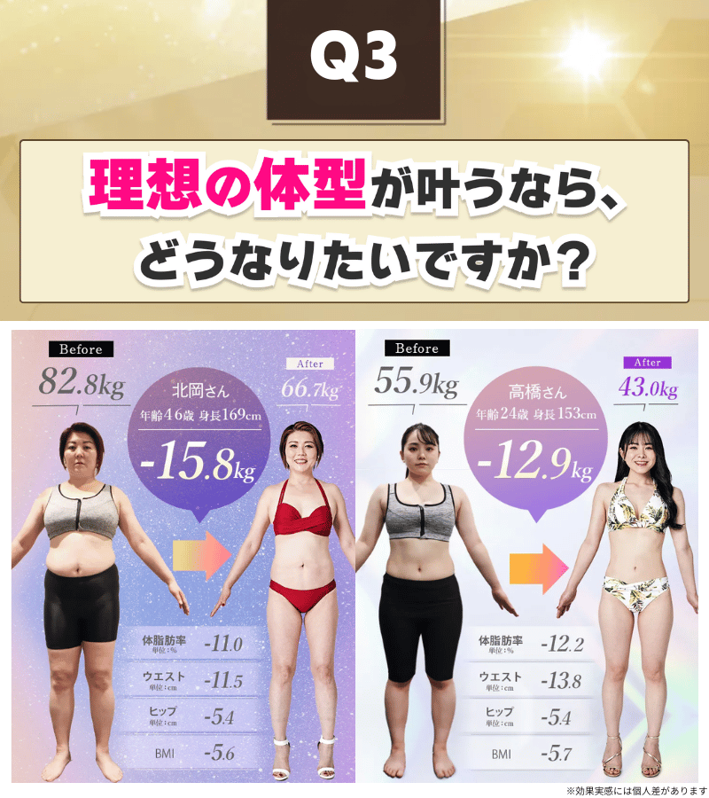 ※3ヶ月医療痩身ボディメイクを契約されたモニター対象の会員の代表的な事例を提示しています。